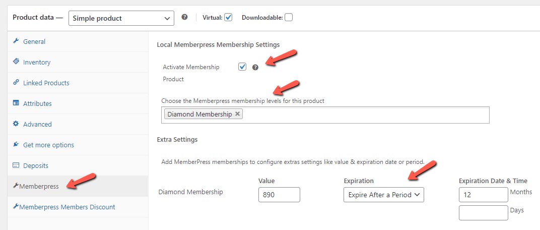 Next, head over to the "MemberPress" tab, activate the membership, and choose the relevant memberships.