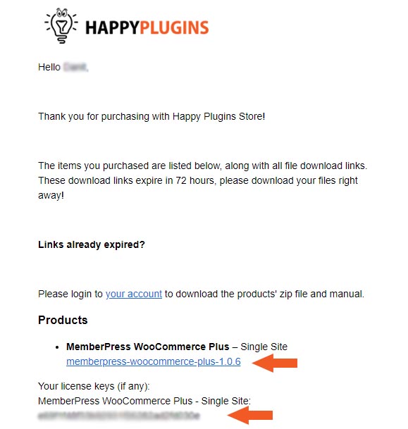 To get started, download the zip file for the MemberPress WooCommerce Plus plugin from the Purchase Receipt that was sent to your email: