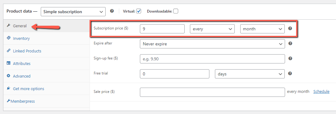 To begin, you will need to input the subscription information, as you would with any other regular WooCommerce subscription product.