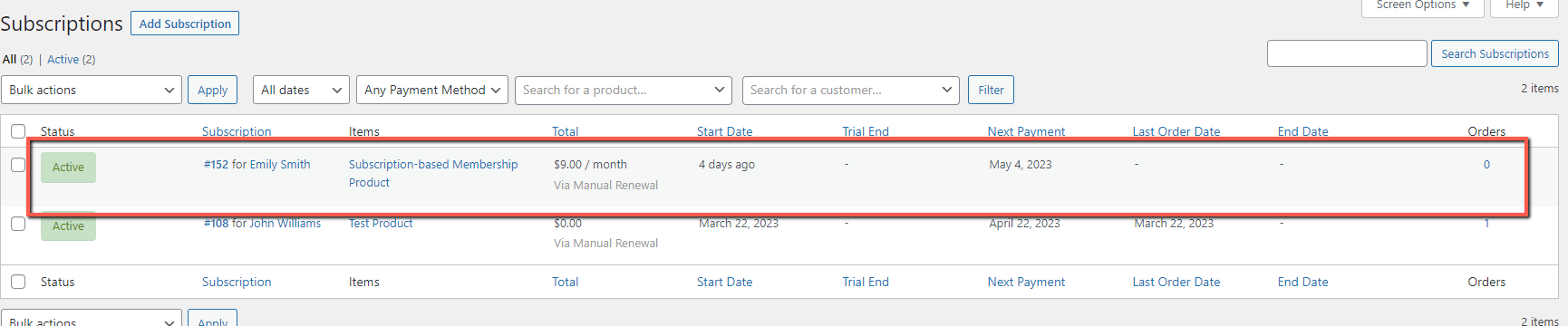 The subscription’s information will be reflected in the WooCommerce: